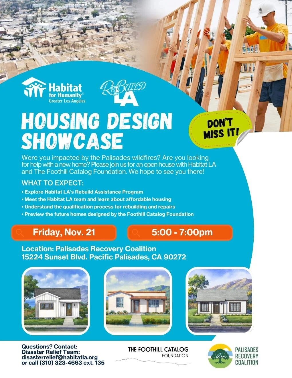 TFCF X HABITAT LA - Housing Design Showcase Friday, November 21, 2025 5:00 PM 7:00 PM Palisades Recovery Coalition 15224 Sunset Boulevard Los Angeles, CA, 90272 United States (map) Google Calendar ICS